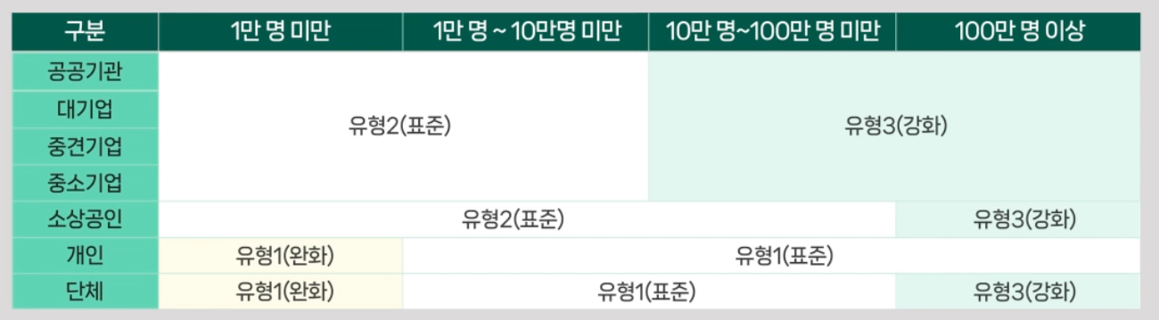- 유형1(완화)에도 개인정보 보호에 필요한 유형2(표준)에 적용되는 안전조치 규정 동일하게 적용