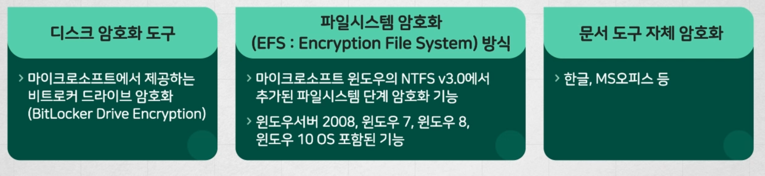 | 컴퓨터, 보조저장매체 등 저장 시 암호화 | 모든 개인정보 | 고유식별정보 |