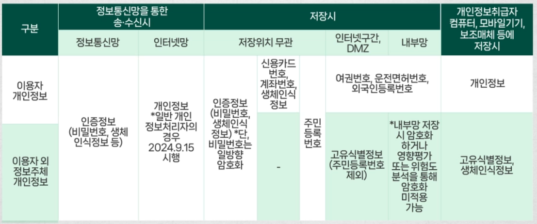 | 정보통신망 전송 시 (내부망 및 인터넷 구간 포함) | 고유식별정보, 비밀번호, 생체인식정보 | - | 고유식별정보, 비밀번호, 생체인식정보 |