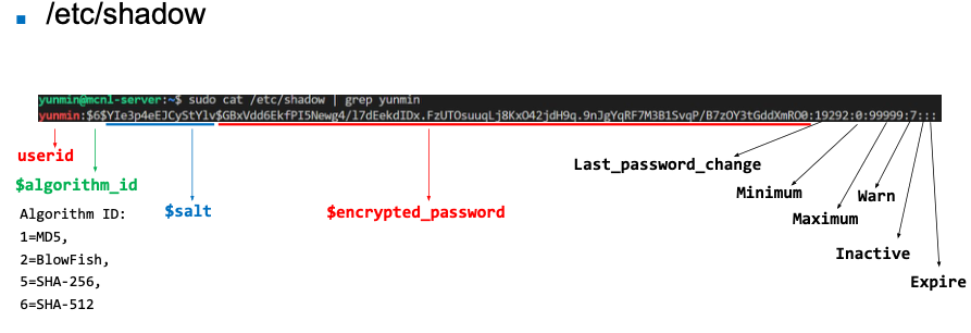 - Unix와 Linux는 shadow password file에 비밀번호를 저장 (