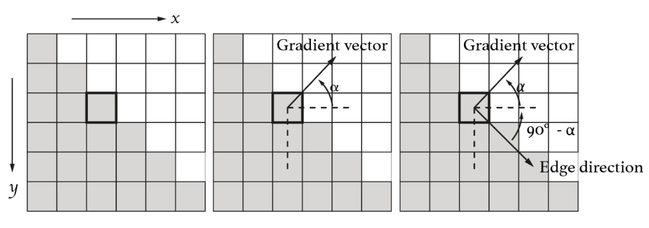 Gradient Vector의 방향은 Edge Direction과 수직인 관계이다.