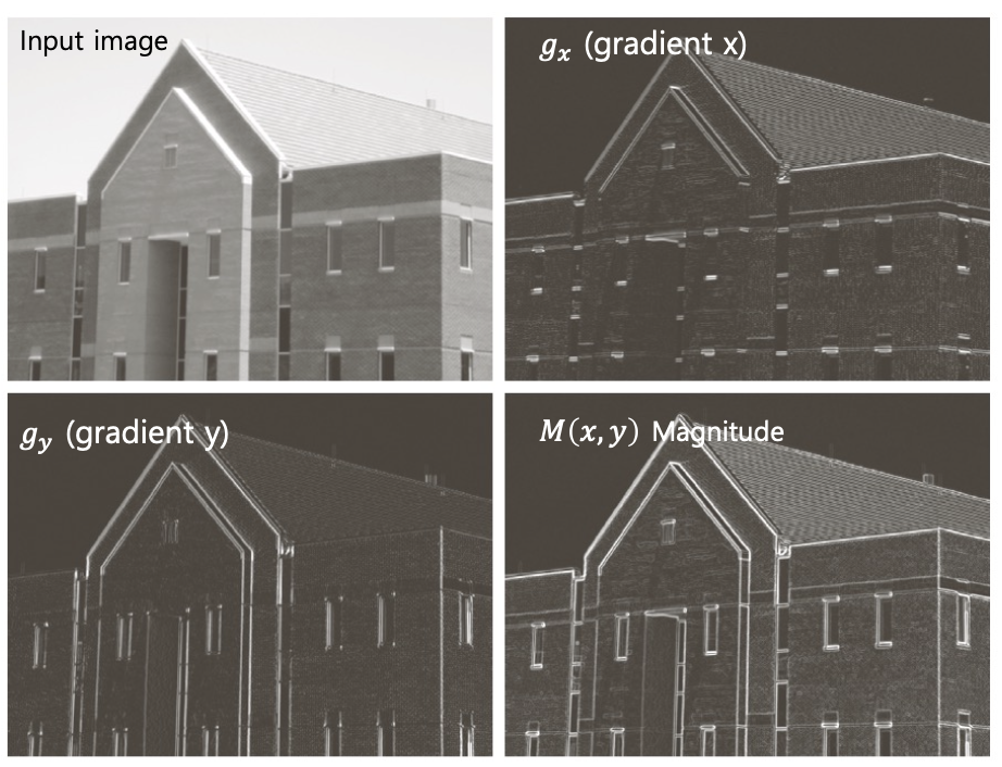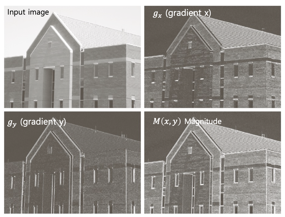 이렇게 구한 Gradient vector 의 크기 (Magnitude) 는 밝기 변화가 얼마나 강한지를 나타낸다.