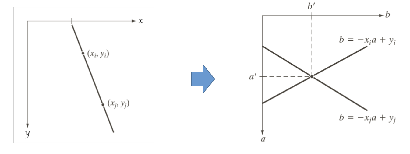 이러면 가 고정된 값일 때 이 픽셀을 통과하는 모든 가능한 직선의 매개변수 조합을 찾을 수 있다.