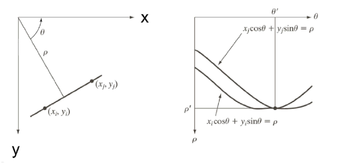 Hough transform은 이 식을 매개변수 , 에 관한 식으로 변환한다