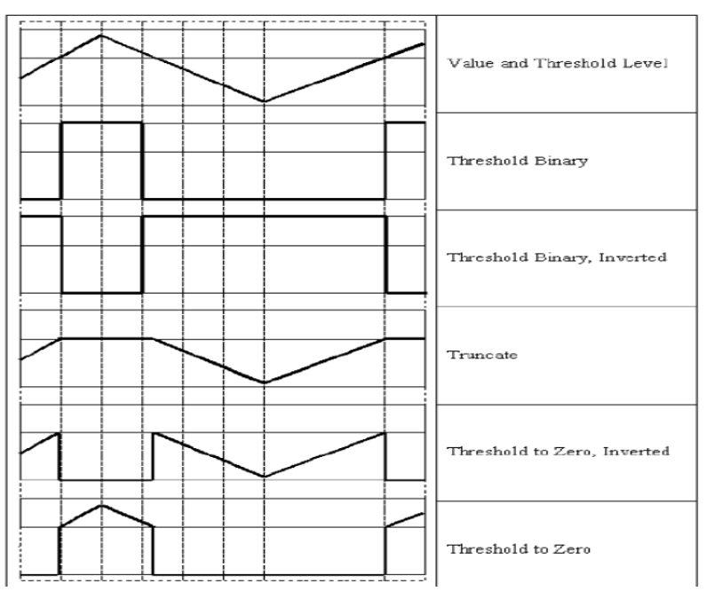 );thresh: 임계값maxval:type의 조건에 따라 픽셀이 임계값을 넘었을 때 할당될 값type: 임계값 적용 방식 결정THRESH_BINARY:thresh보다 크면maxval로, 작거나 같으면 0으로THRESH_BINARY_INV:THRESH_BINARY의 inverseTHRESH_TRUNC:thresh보다 크면thresh값으로 바꾸고 작거나 같으면 그대로THRESH_TOZERO:thresh보다 크면 그대로, 작거나 같으면 0으로THRESH_TOZERO_INV:THRESH_TOZERO의 inverse