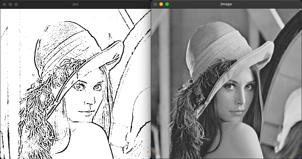 );maxval: 임계값을 통과한 픽셀에 적용할 값adaptiveMethod: 임계값을 계산하는 방법ADAPTIVE_THRESH_MEAN_CADPATIVE_THRESH_GAUSSIAN_C