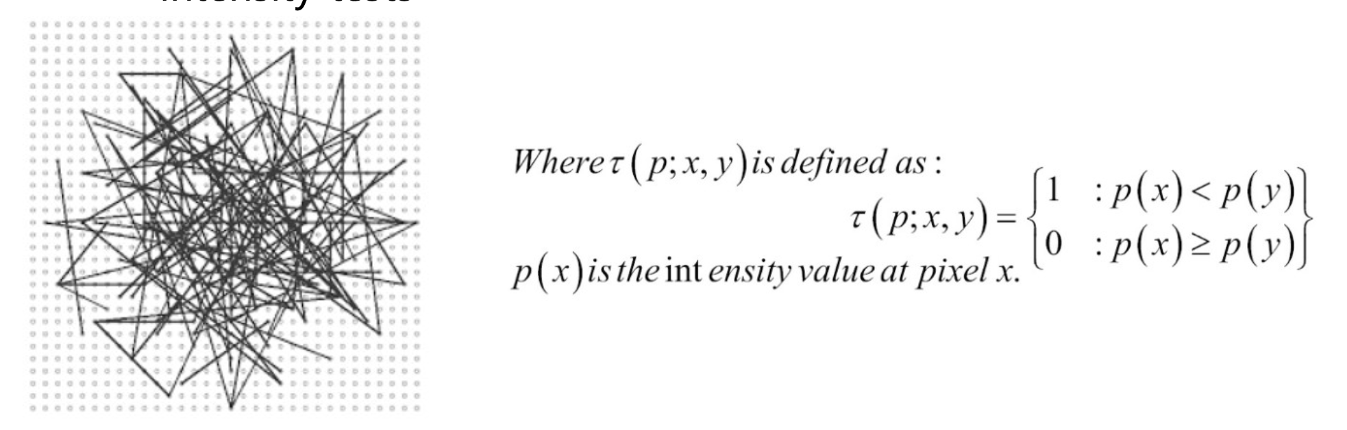 feature 점 주변에 무작위 픽셀 x, y 쌍을 선택해서 두 픽셀의 intensity를 비교해서 x가 y보다 작으면 1 아니면 0